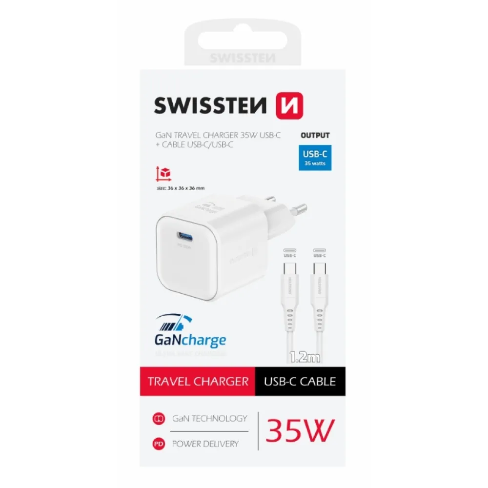 Swissten GaN 1x USB-C 35W tápegység + USB-C/USB-C kábel 1,2m - fehér