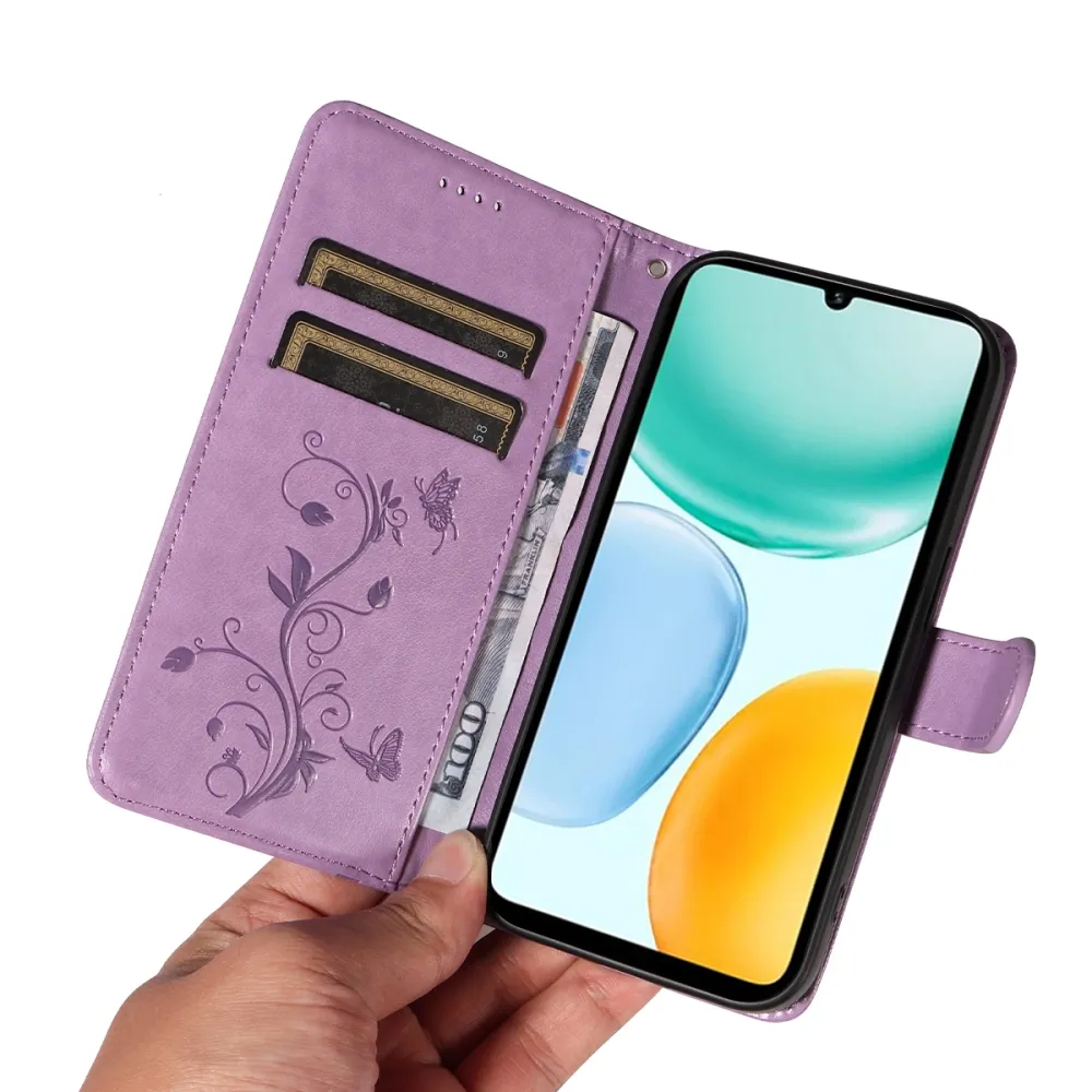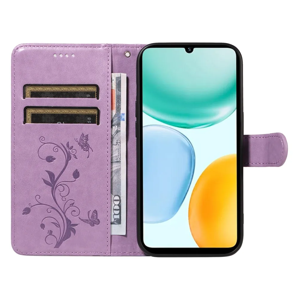 Világoslila virágos pénztárca tok Honor X5c Plus készülékhez