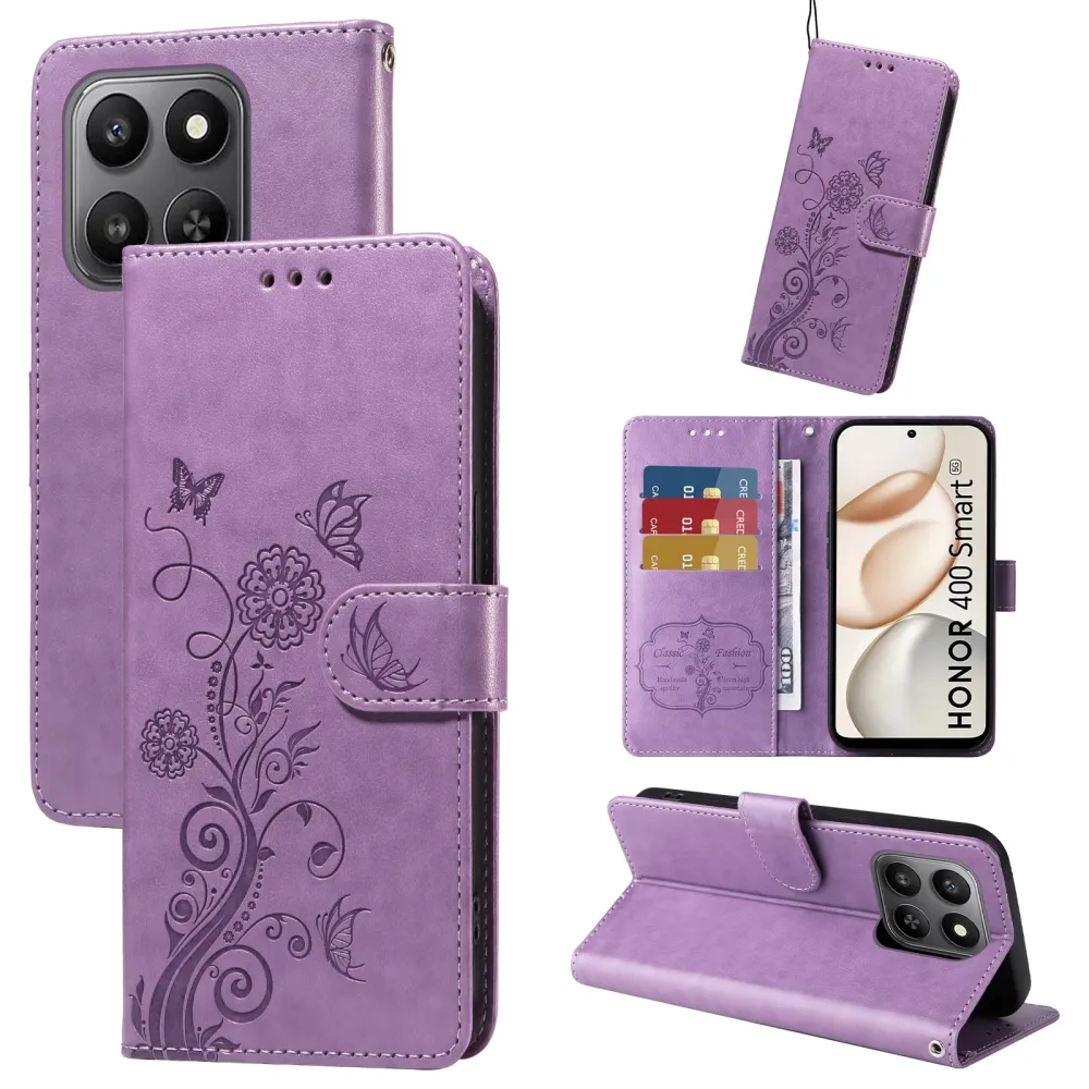 Lila virágos pénztárca tok a Honor 400 Smart 5G/4G/Honor X7d számára